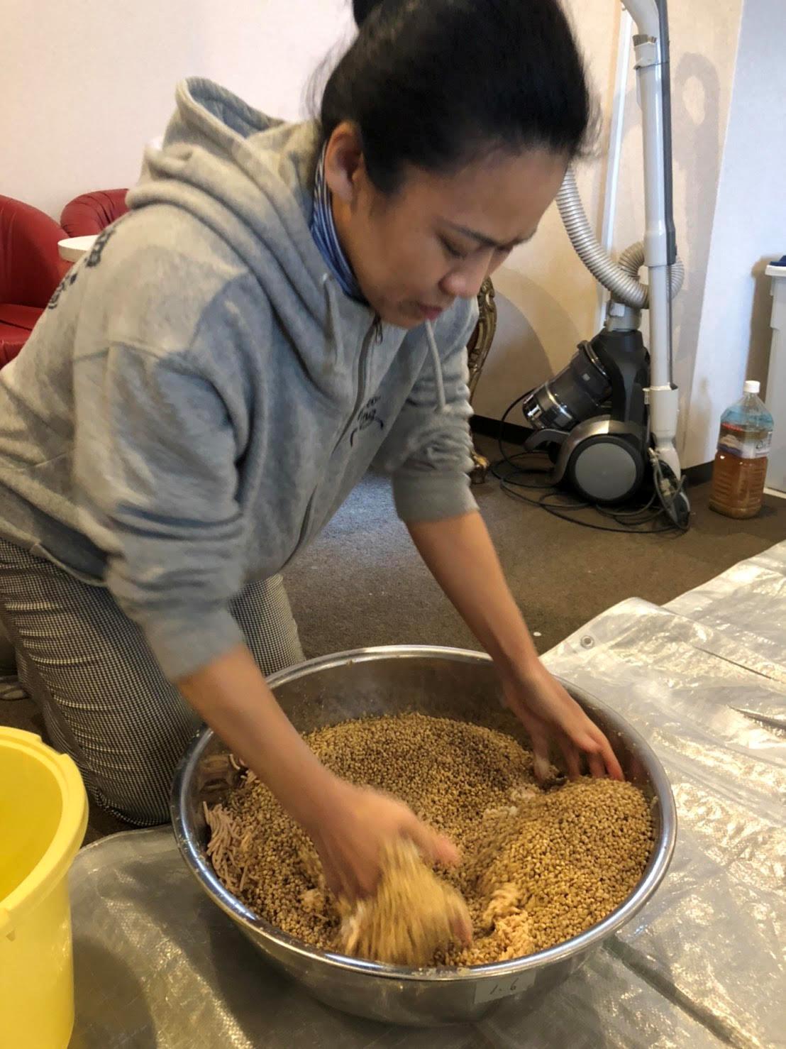 大豆を水に2日ほど浸し、そのままコツコツと柔らかくなるまで煮て、その大豆を潰し後は、麹と塩とで混ぜるだけ!混ぜる時のあの感触は、とても気持ち良かったです。梅雨明けに、もう一度混ぜて(天地返し)、11月くらいから食べられるそうです。待ち遠しいです。煮汁は、イソフラボンの塊なので、捨てずに煮物に出汁として使いました。とっても美味しかったです。ほんとに捨てるところがないですね。皆さんも、ぜひ作ってみて下さいね。